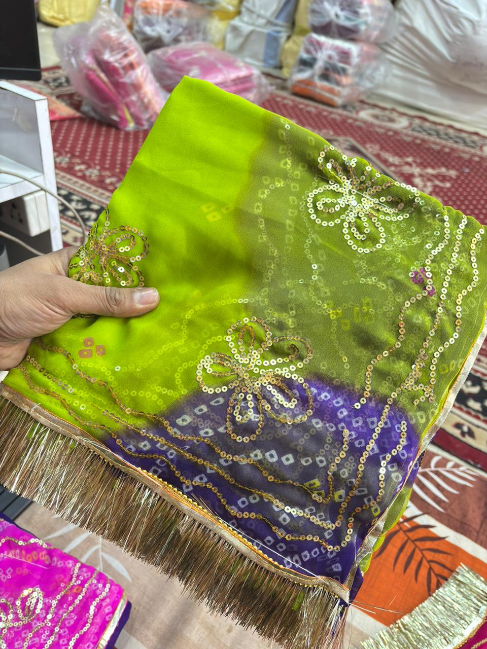 Ghewar Tari Gold Pure Poshak (Metallic Green and Blue)- 786